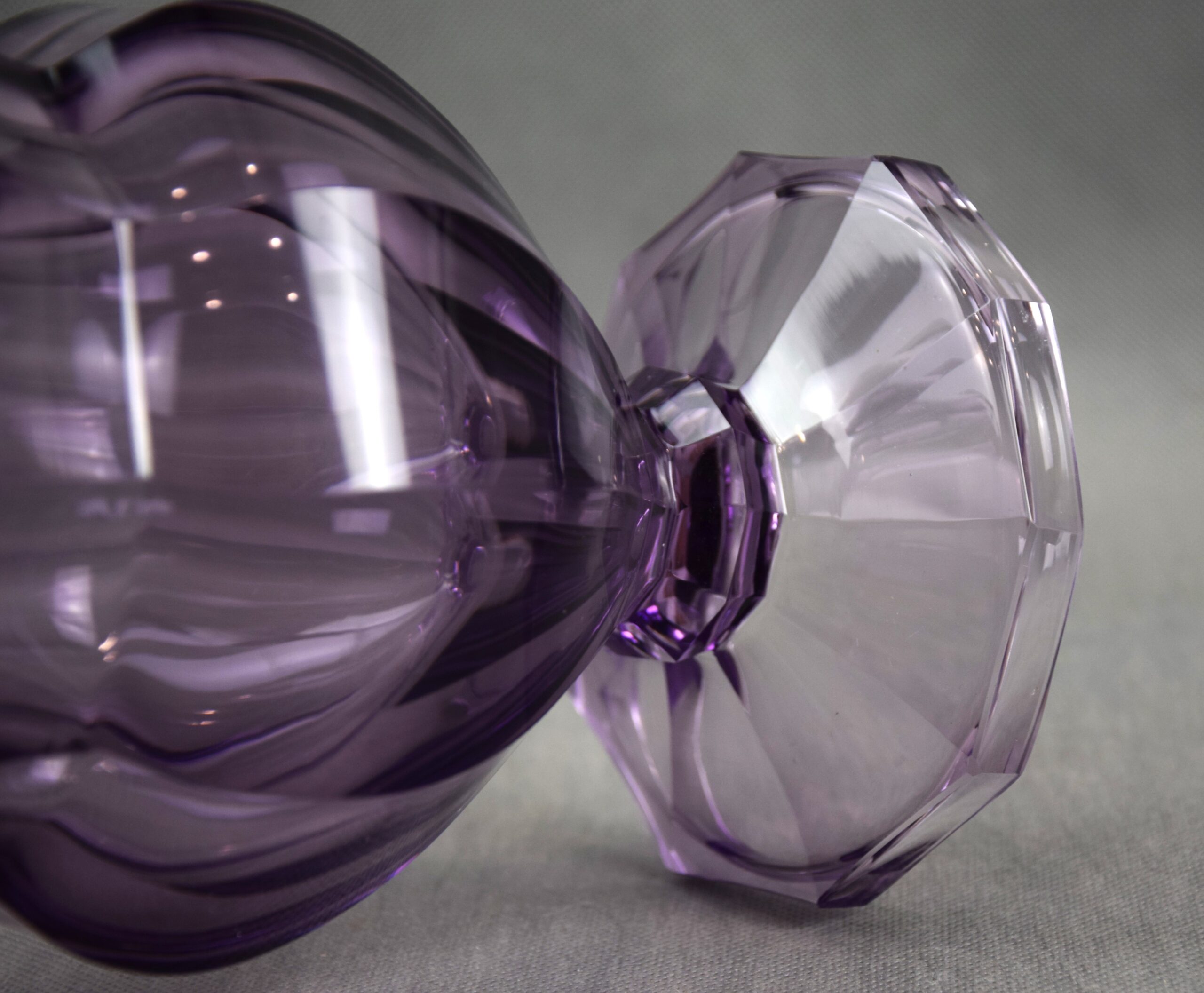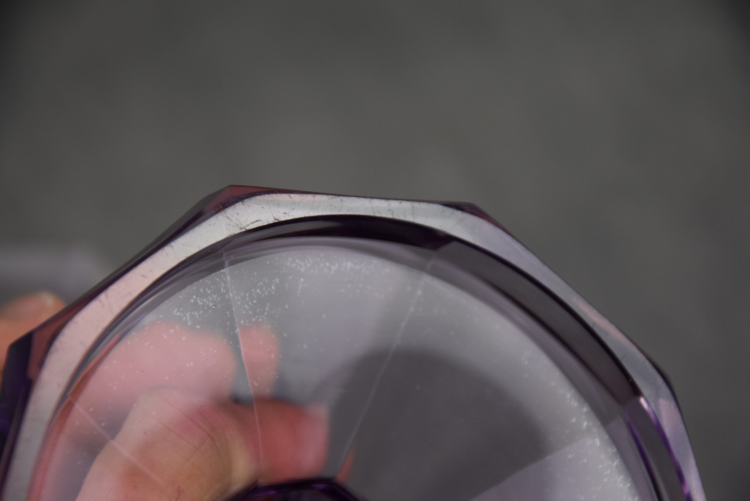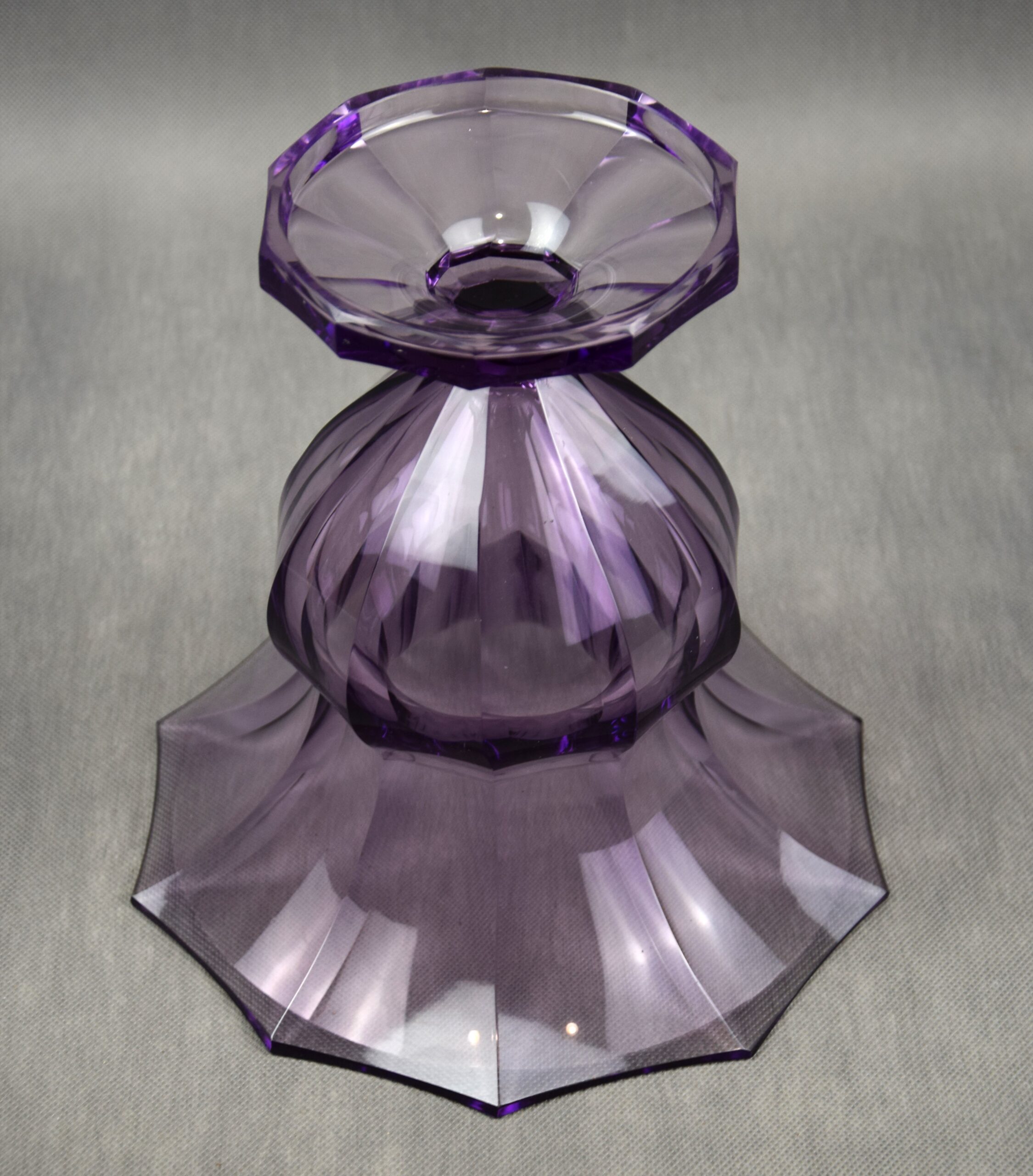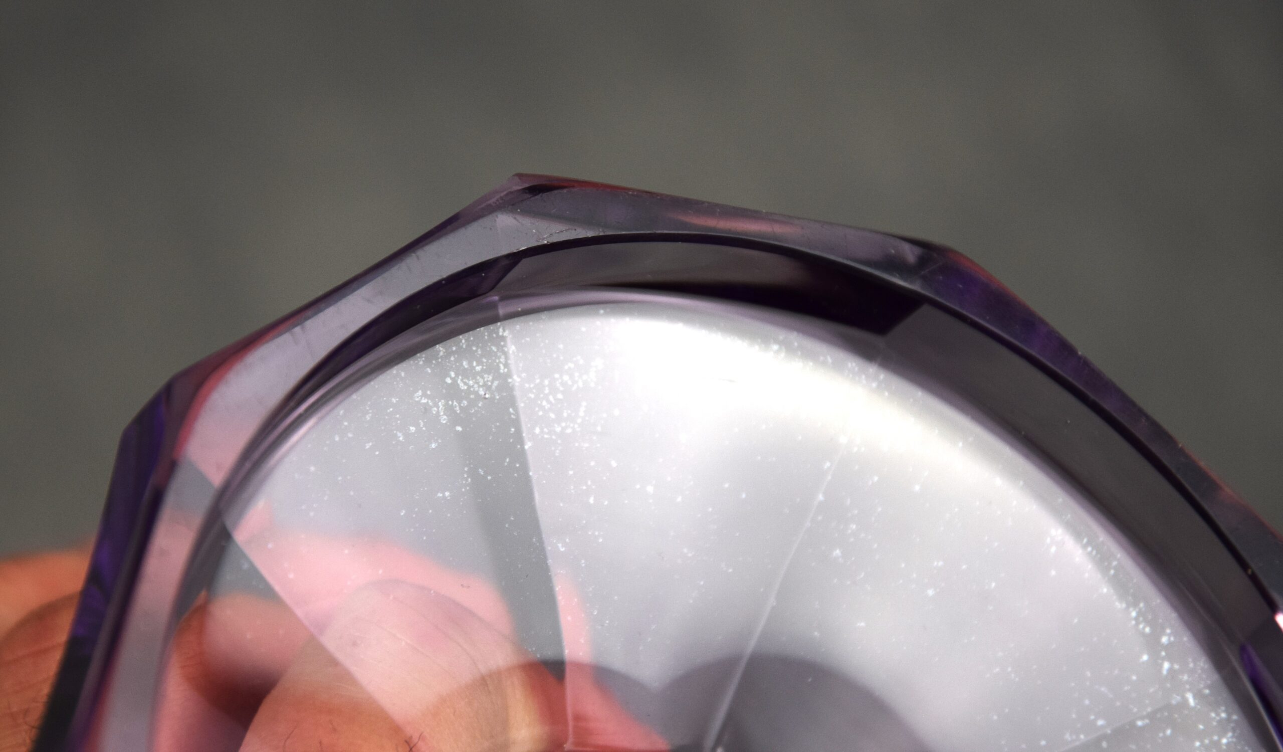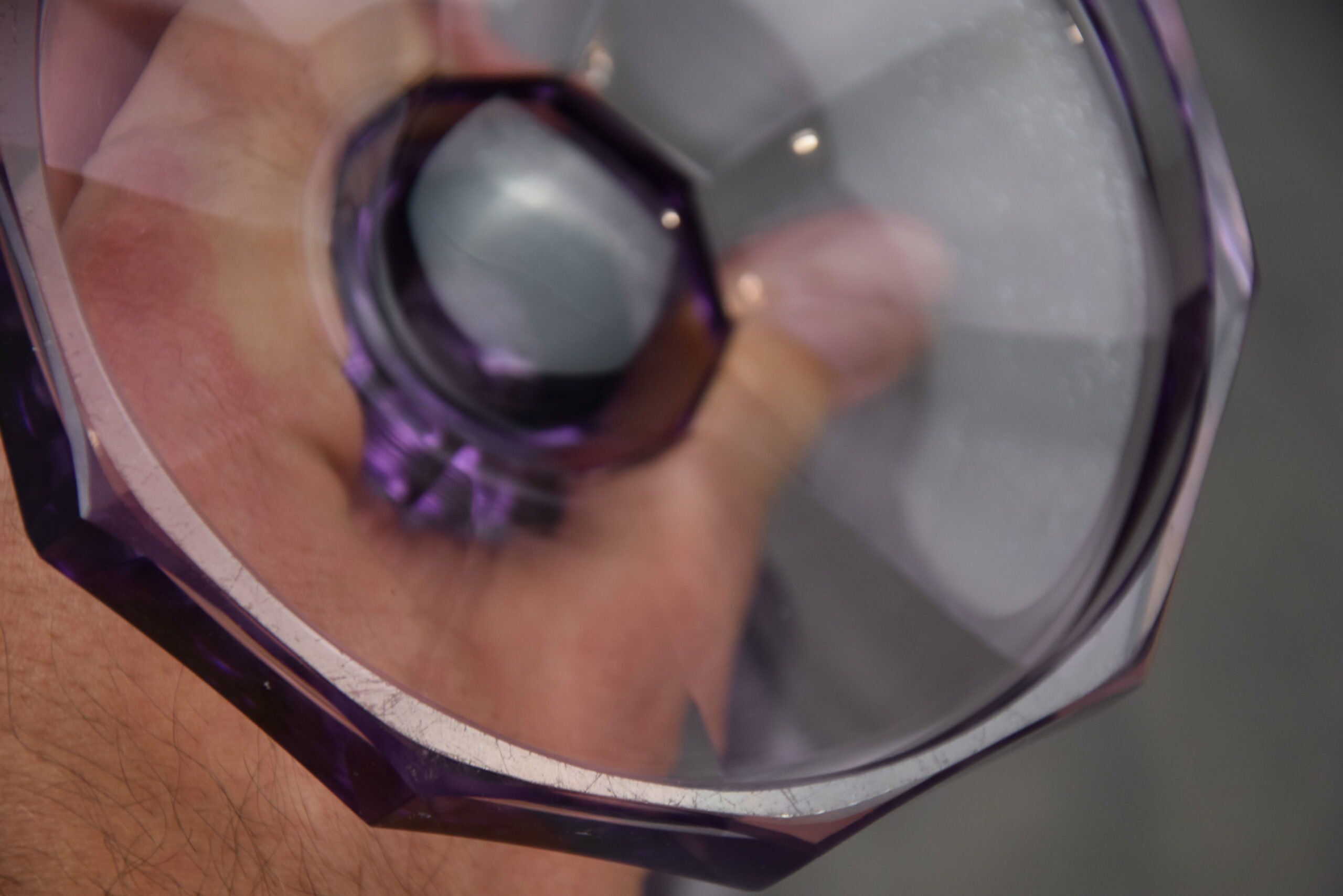 Szkło barwione w masie na kolor fioletowy, szlifowane.