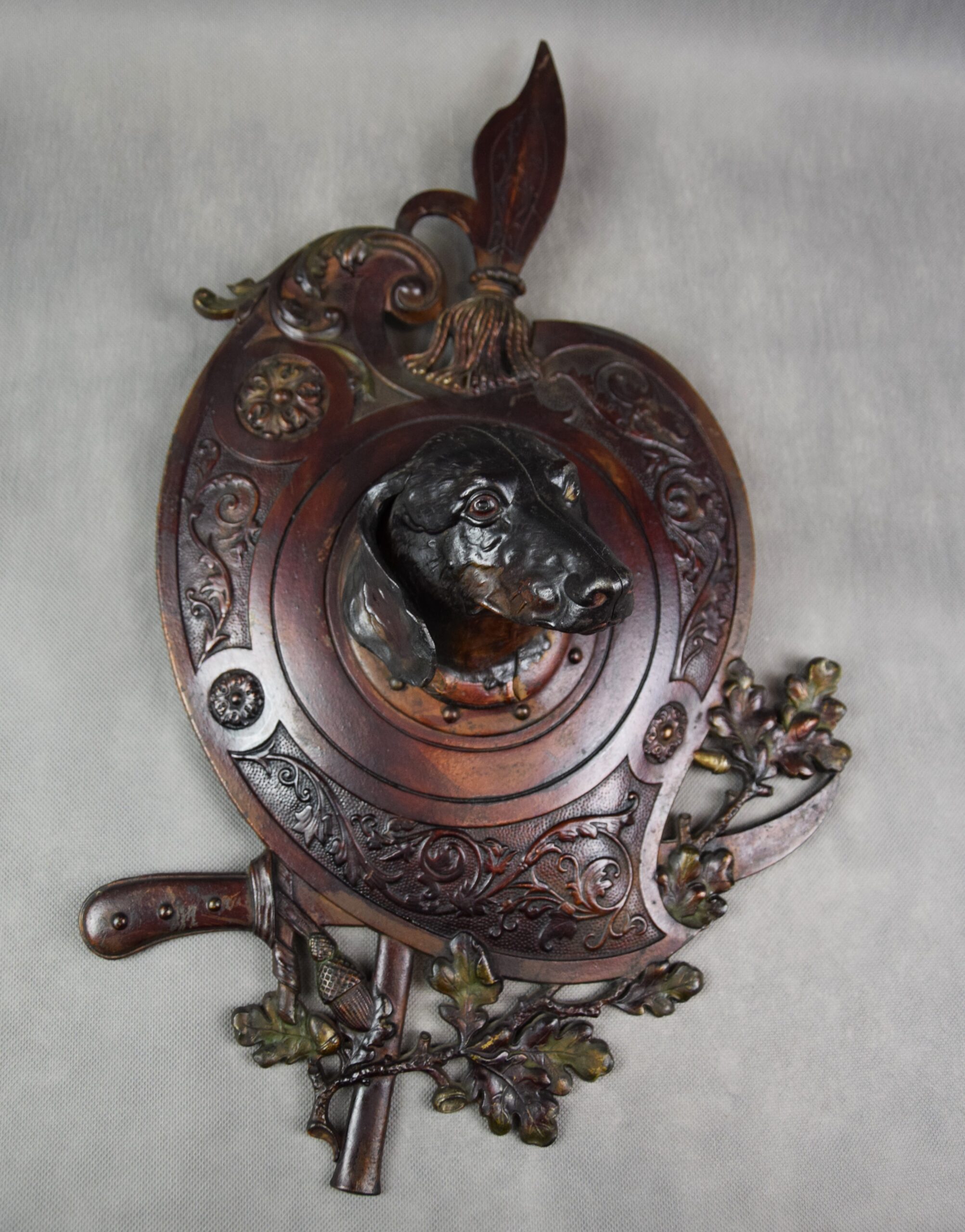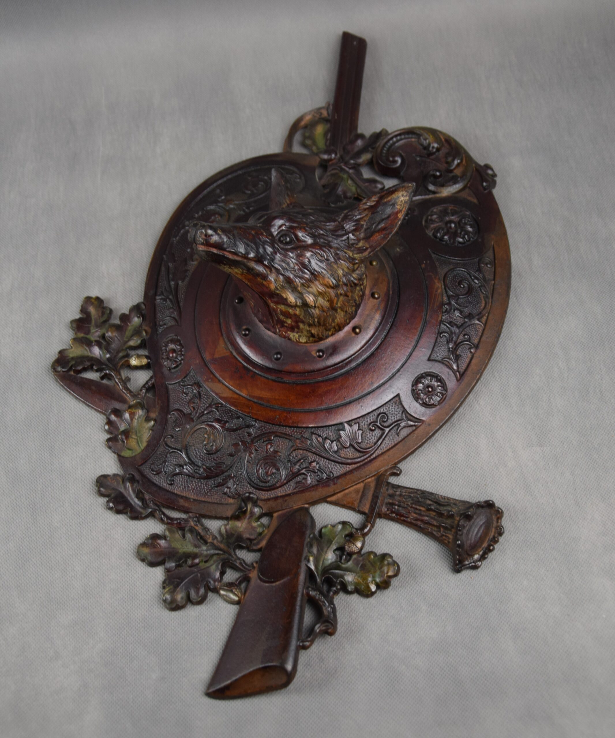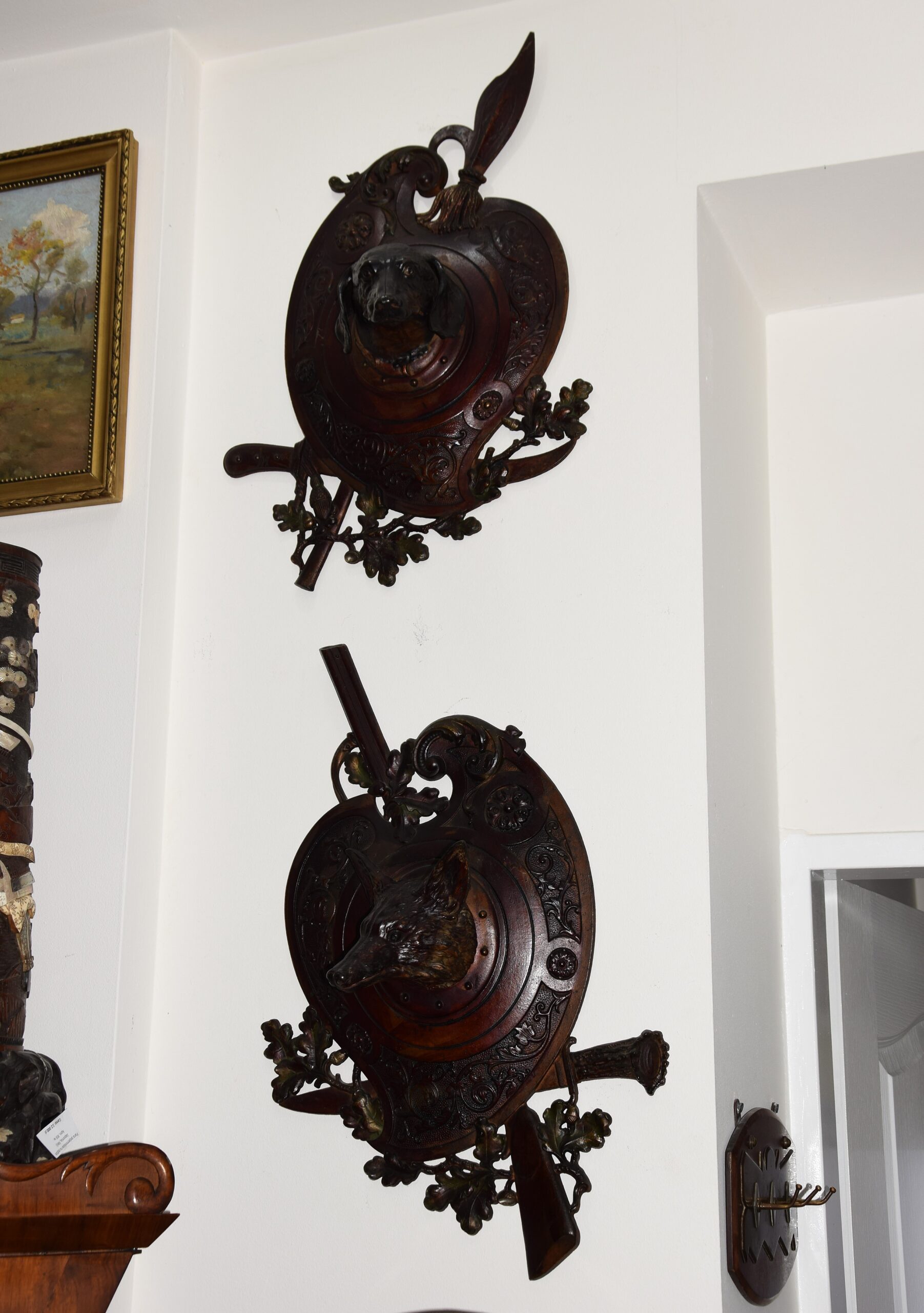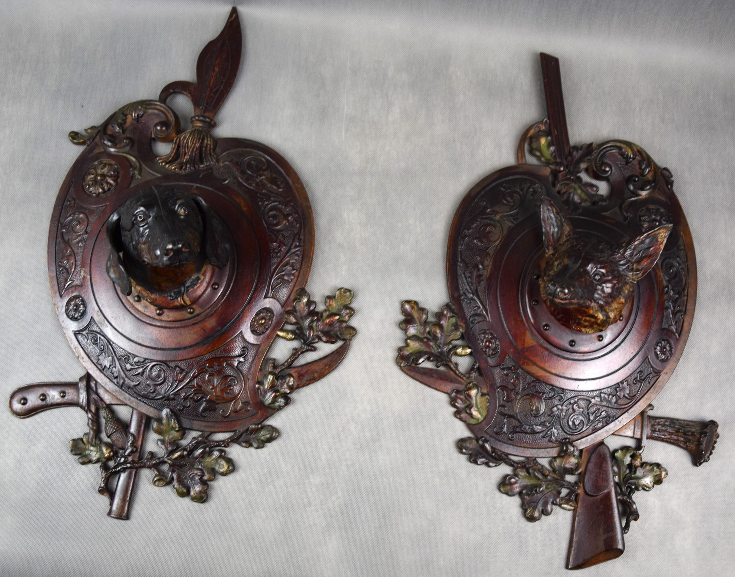 Para dekoracyjnych plakiet o tematyce myśliwskiej w formie trofeum – panoplium łowieckie.