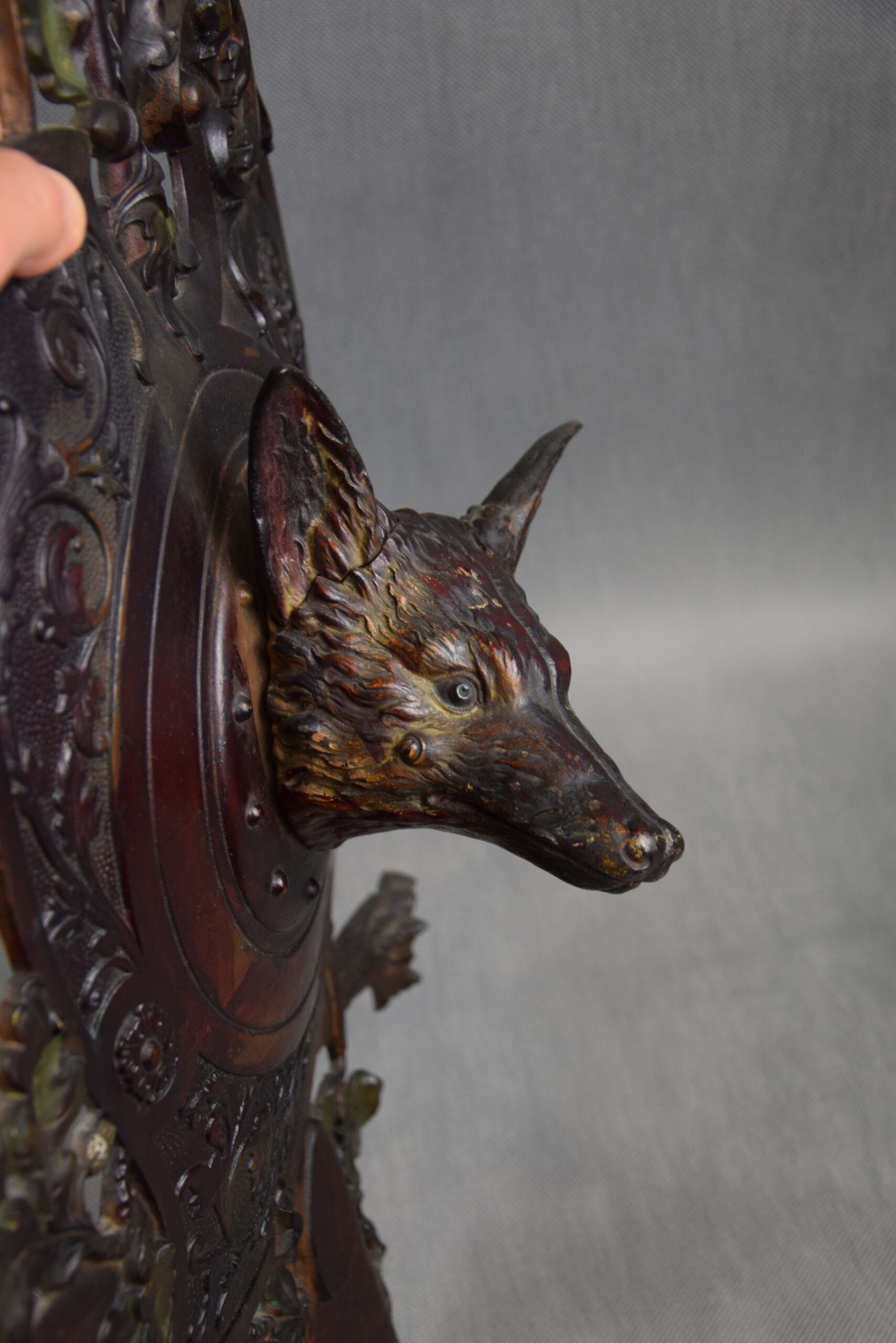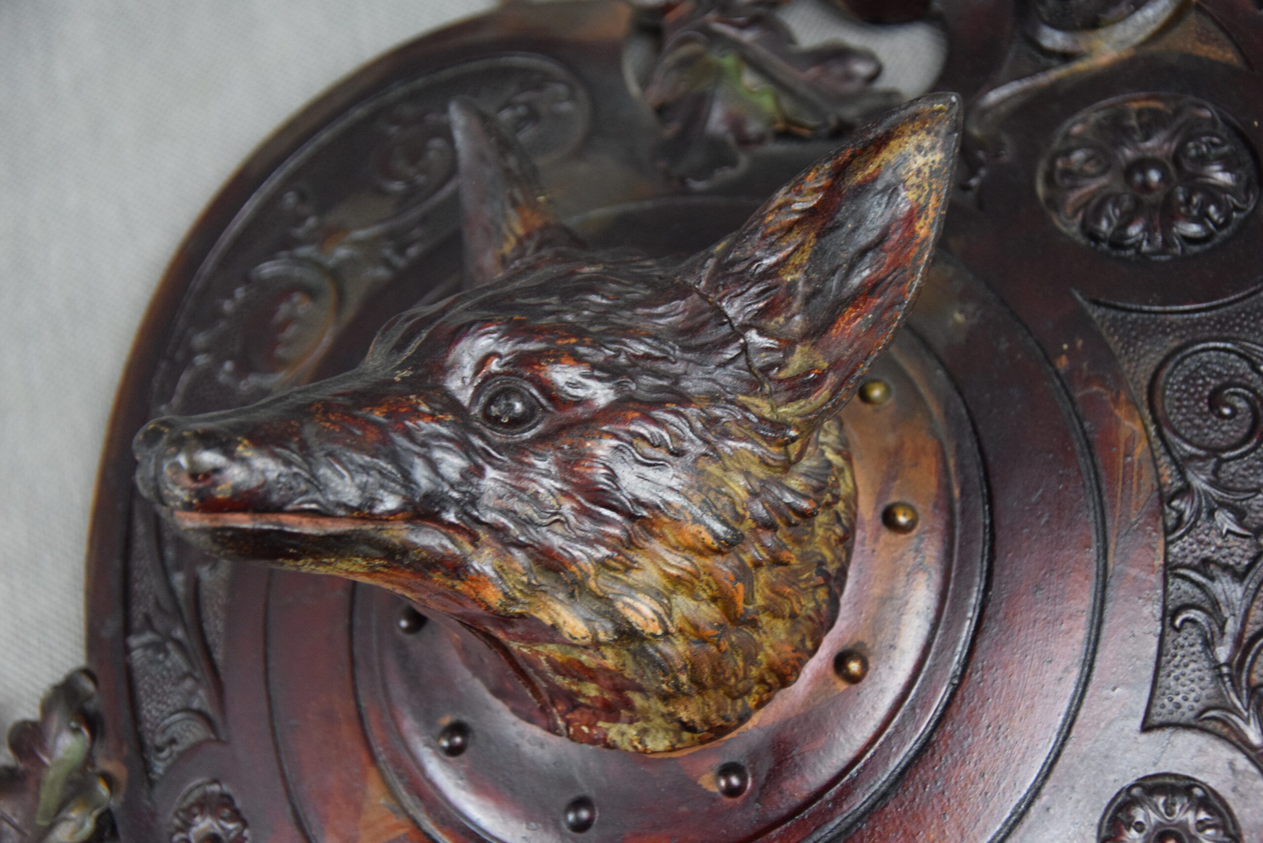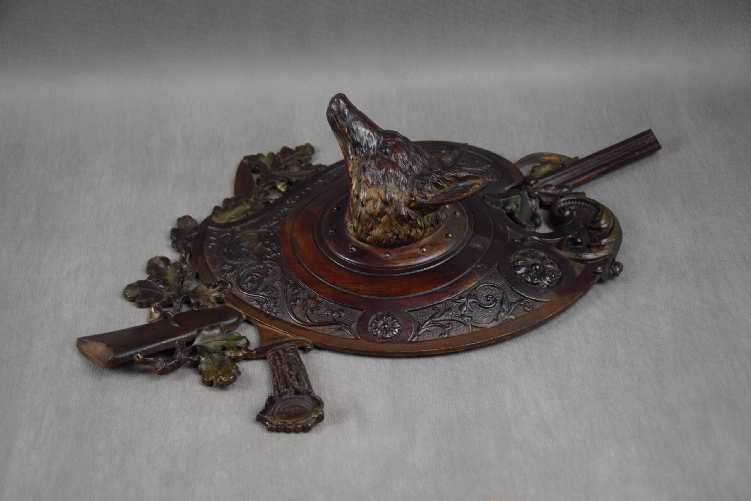 Para dekoracyjnych plakiet o tematyce myśliwskiej w formie trofeum – panoplium łowieckie.