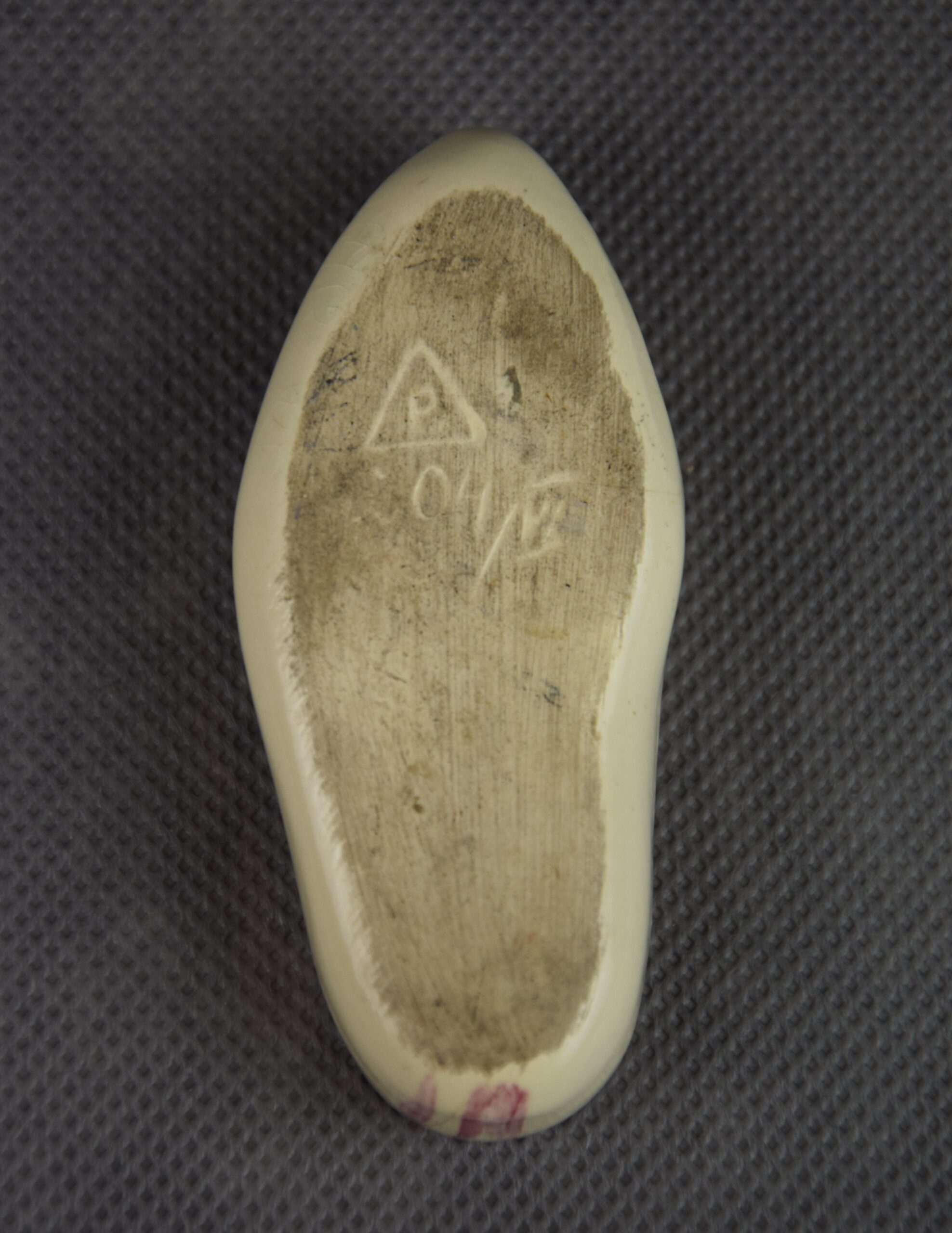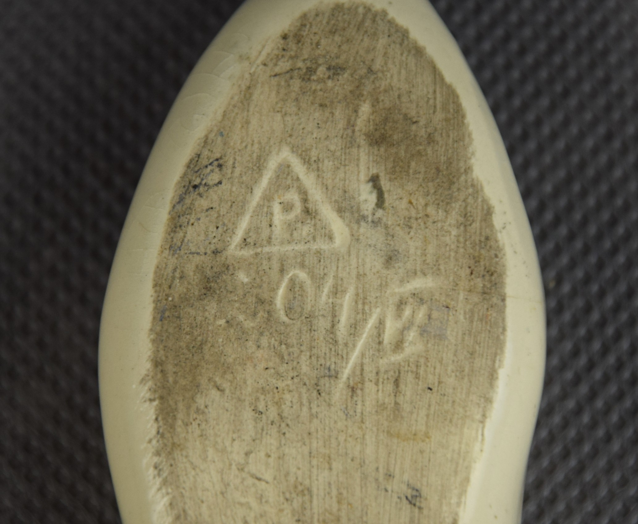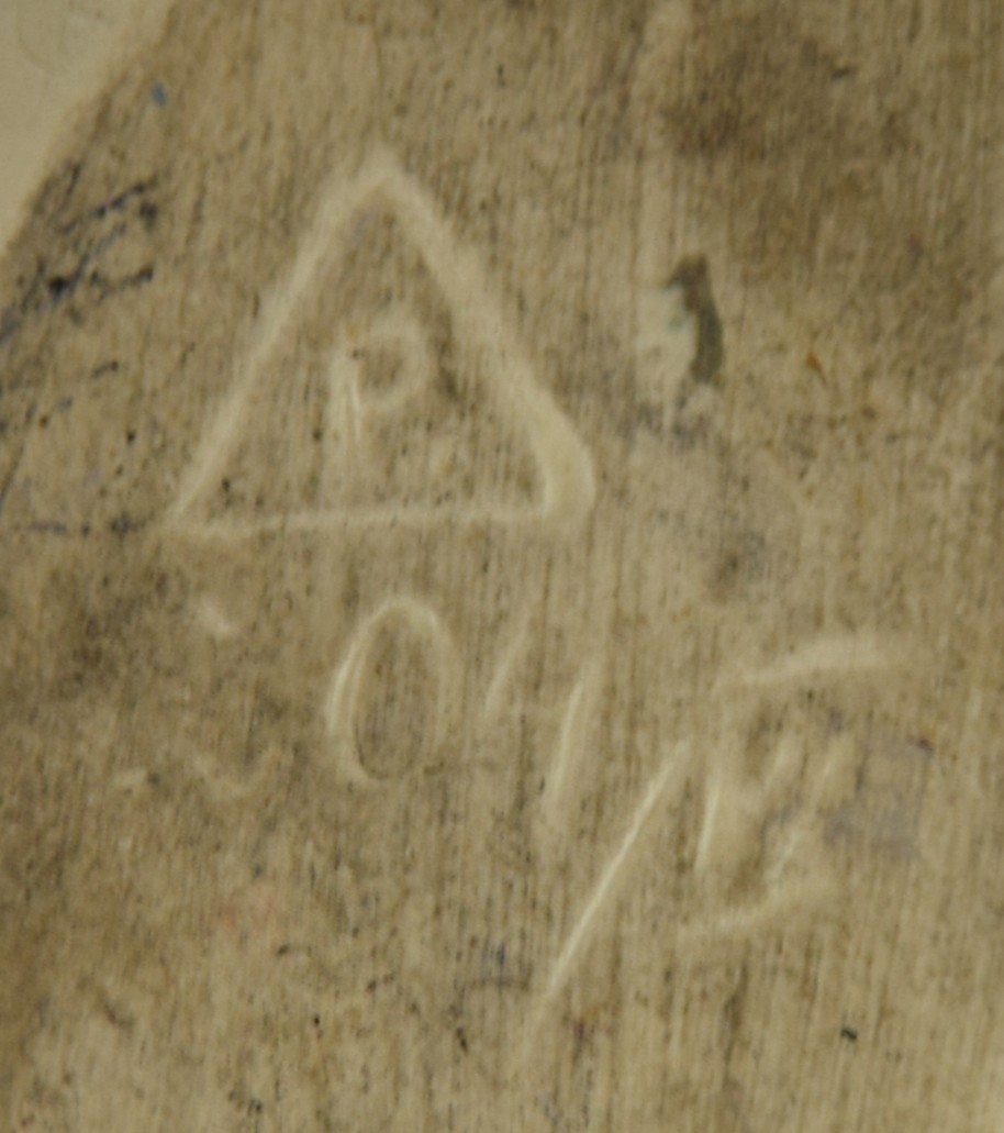 Sygnowany na spodzie wyciśniętym w nieszkliwionym czerepie znakiem fabrycznym „P” w trójkącie oraz numerami fabrycznymi.