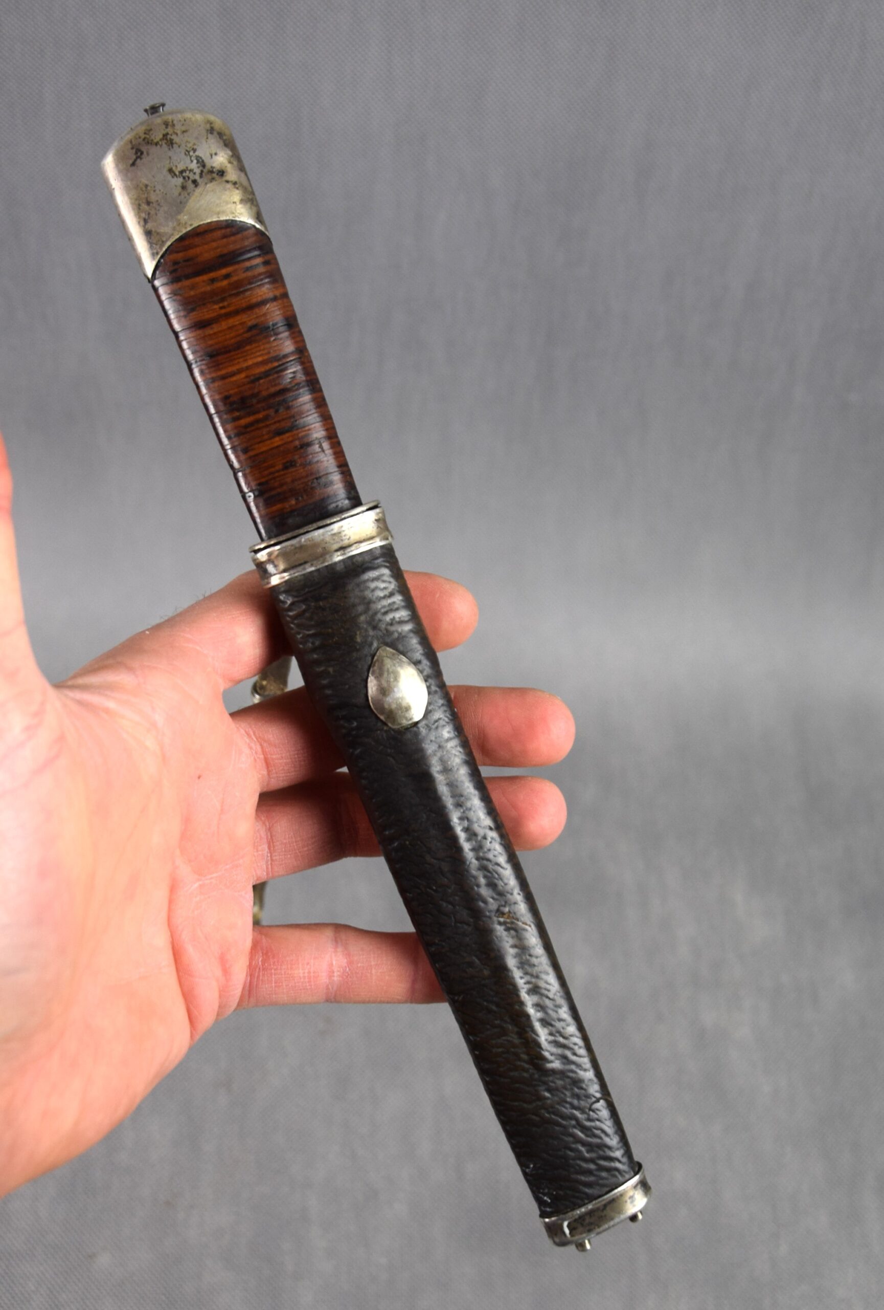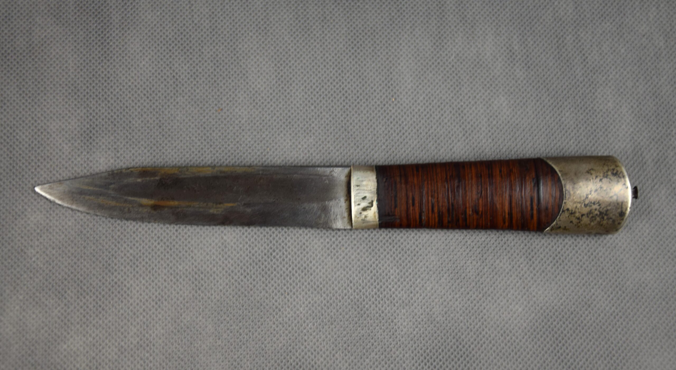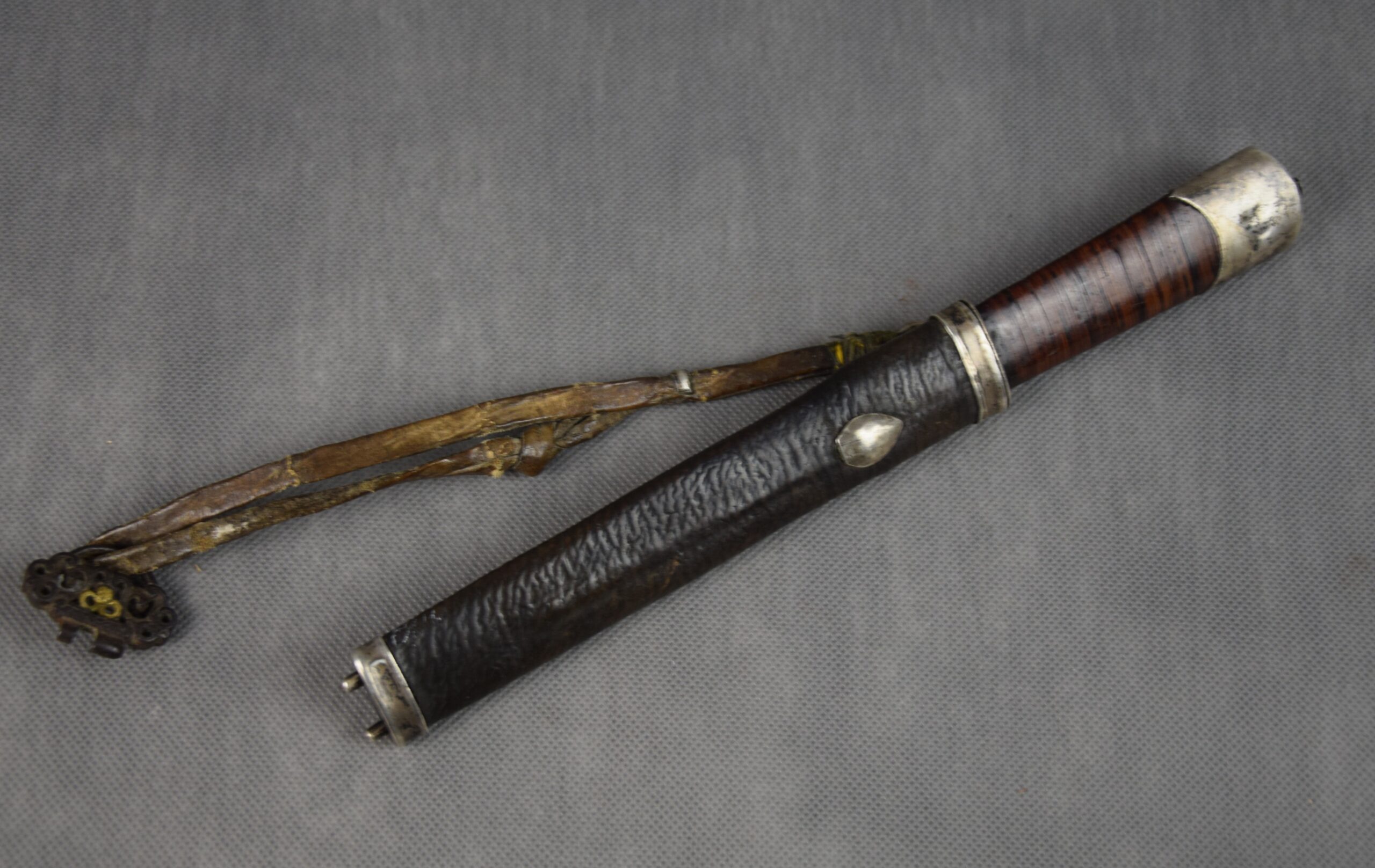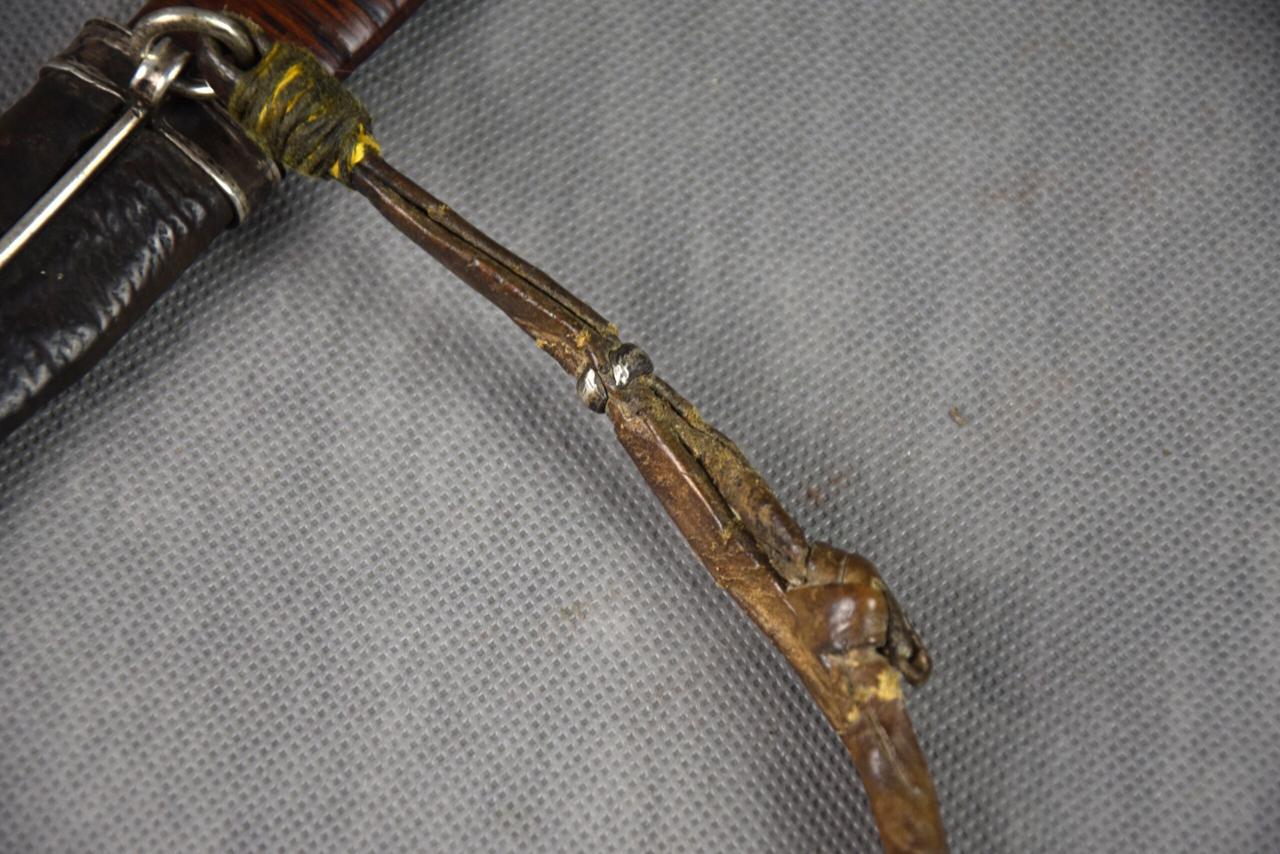 Sztylet w pochwie na rzemieniu z zawieszką z brązu.